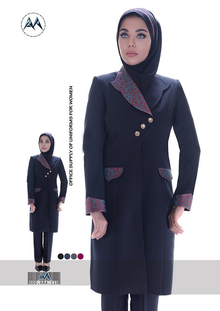 مانتو و شلوار آرافرم مدل یقه خورشیدی با طراحی زیبا و دوخته شده با پارچه کاریش ترک (مشکی وسرمه ای) و ترمه مناسب چهار فصل و عدم ایجاد حساسیت پوستی و بوی بد قابل سفارش در رنگ های مورد نظر هر سازمان و ارگانی.